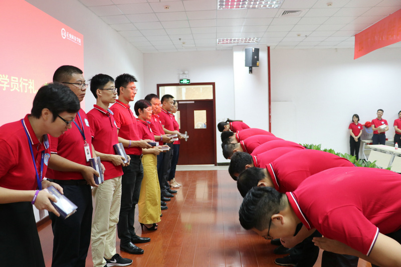 开班仪式上举行了庄严的拜师仪式,42位储备高管分别给老师们行拱手礼,感谢老师们的悉心栽培,从此发奋图强,为公司的事业再创辉煌,老师们赠书给学员作为回赠。